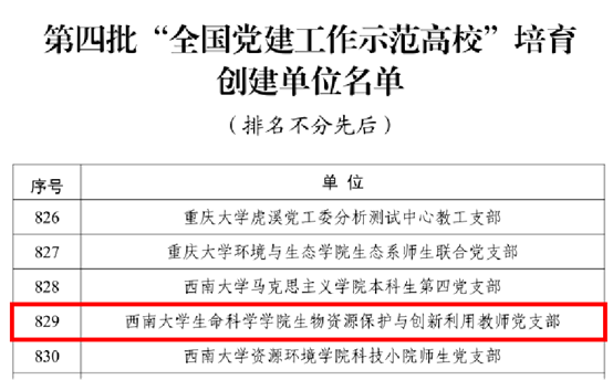 近日,教育部公布第四批全国党建工作示范高校、标杆院系、样板支部培育创建单位名单,共遴选产生了10个全国党建工作示范高校、100个全国党建工作标杆院系、1001个全国党建工作样板支部培育创建单位。其中,开云kaiyun网页版官网生物资源保护与创新利用教师党支部入选第四批全国党建工作样板支部。