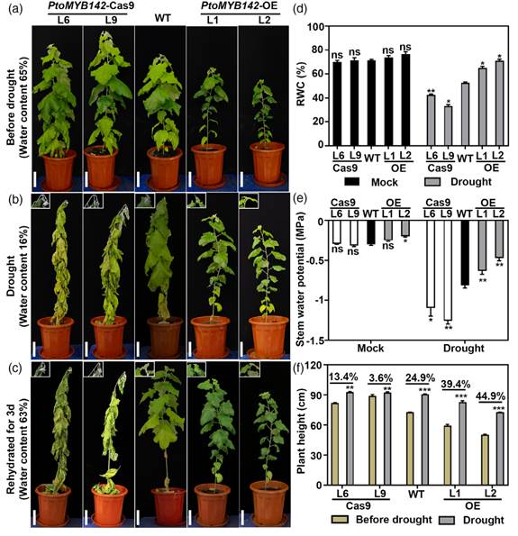 该研究发现,R2R3型MYB转录因子PtoMYB142在杨树叶片和发育中次生木质部被干旱诱导。过表达PtoMYB142显著抑制了叶片细胞膨胀,导致杨树叶面积减小,同时茎导管密度增加、导管的管腔面积减小,进而减少了杨树叶片水分的散失,并维持了干旱胁迫下的茎水势。转录组分析及含量测定实验等表明PtoMYB142通过调控赤霉素含量稳态响应干旱胁迫。