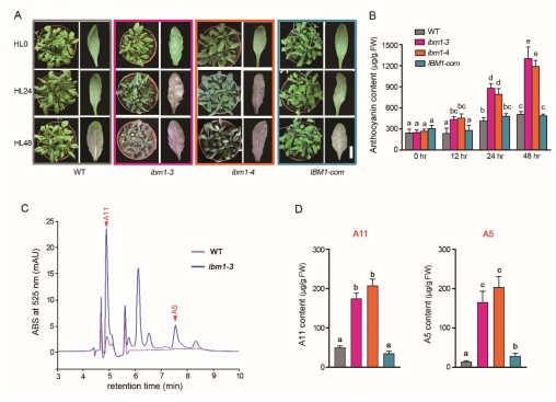 该研究首先发现在拟南芥莲座叶中IBM1的表达受高光胁迫的诱导。随后发现,IBM1的突变使植物对环境光更敏感,导致高光下花青素的过量积累,并促进了花青素合成余调控通路基因的表达(图1),表明IBM1在拟南芥花青素合成适应环境光照中扮演了重要作用。