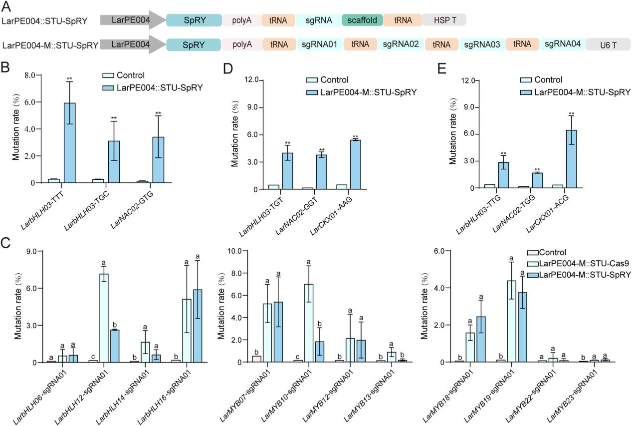 此外,为扩大CRISPR系统应用范围,研究者引入Cas9变体SpRY构建LarPE004::STU-SpRY系统,实现在多种非典型PAM序列(如5’-TGC-3’,5’-GTG-3’)的有效编辑,进一步提升了系统的通用性与适应性(图4)。最终结果表明,LarPE004驱动的STU-Cas9及其变体系统不仅适用于蛋白编码基因,也适合于miRNA等非编码RNA的敲除研究,是落叶松等针叶树开展基因功能研究和分子改良的优选基因编辑工具。
