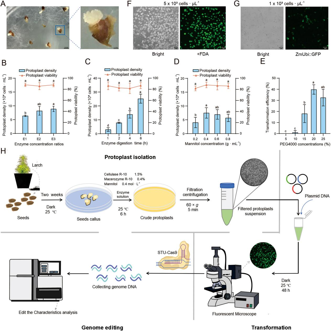 研究者首先优化了落叶松成熟种子诱导愈伤组织的原生质体制备与瞬时转化技术体系,通过对酶解液配比、酶解时间、甘露醇浓度等关键参数的优化,获得了落叶松原生质体制备和转化的最佳方案:使用愈伤组织进行6 小时酶解,采用含有 0.4 mol・L⁻¹ 甘露醇、1.5% 纤维素酶和 0.4% 离析酶的酶混合物,在 60×g 下收集原生质体,细胞活性达到90%以上;对于转化,使用20% PEG4000 可达到 40% 的效率,这为落叶松基因组编辑体系的评估奠定了基础(图1)。
