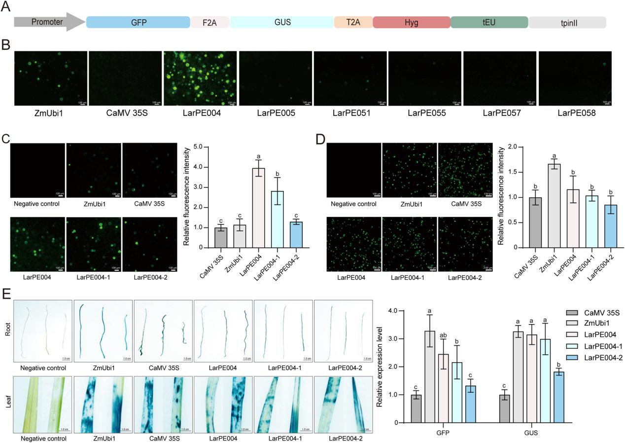 随后,研究者基于前期落叶松全基因组与转录组数据筛选出41个高水平表达的候选启动子,最终鉴定出在落叶松、水稻及杨树等物种中均可高水平表达的,具显著优势的LarPE004启动子,其驱动的GFP表达强度远高于CaMV35S与ZmUbi1等基因工程常用的组成型启动子(图2)。