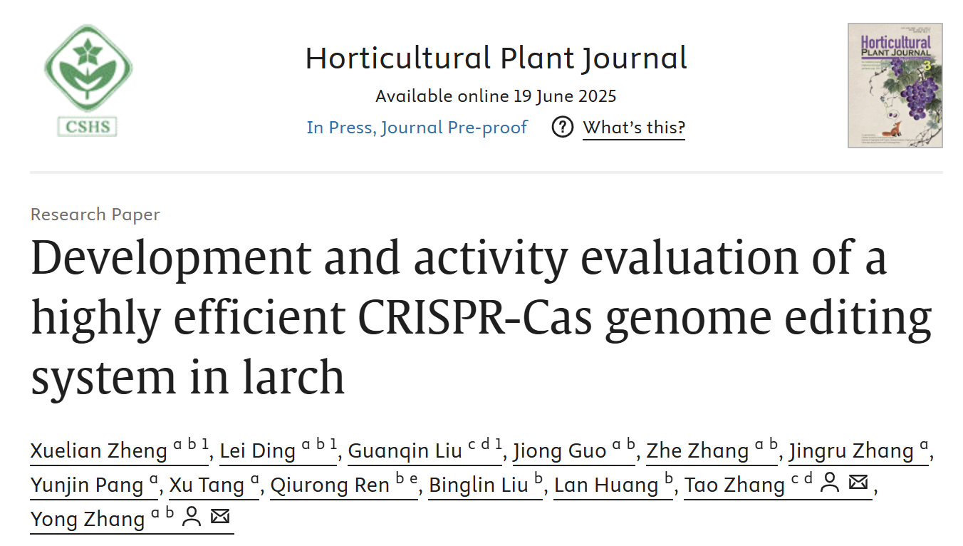 2025年6月20日,Horticultural Plant Journal杂志在线发表了由西南大学张勇课题组及其合作团队题为“Development and activity evaluation of a highly efficient CRISPR-Cas genome editing system in larch”的研究论文,该研究构建并评估了基于落叶松内源启动子的CRISPR/Cas 基因组编辑系统。落叶松(Larix kaempferi)是我国重要的造林和木材生产树种,具有材性优良、抗逆性强、用途广泛等诸多优点。CRISPR/Cas系统是近年来植物基因组编辑领域的核心工具之一,广泛应用于多种植物的功能基因研究与精准育种。然而,受落叶松基因组庞大、遗传背景复杂、生命周期长、遗传转化困难等因素影响,落叶松基因组编辑工具较为匮乏,相关研究进展也十分缓慢。为了突破落叶松基因组编辑研究瓶颈,研究团队基于前期组学分析结果,成功鉴定到高水平表达的落叶松内源启动子LarPE004,并成功建立了高效的LarPE004::STU-Cas9和LarPE004::STU-SpRY单转录单元基因组编辑系统,在多个靶基因位点实现了高效稳定编辑,为落叶松的功能基因组学研究和分子育种提供了可靠的工具。