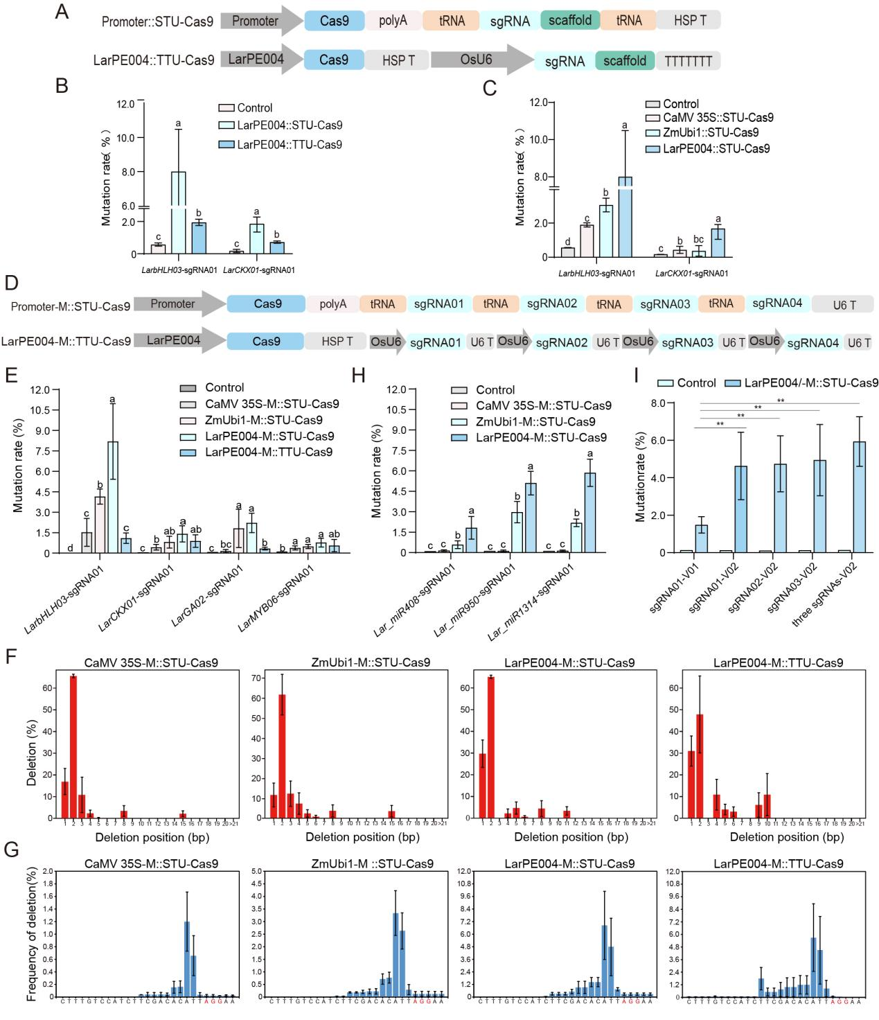 研究者基于LarPE004 启动子及其他基因元件,开发了落叶松基因组编辑系统LarPE004::STU-Cas9和 LarPE004::TTU-Cas9(图3A)。LarPE004 驱动的 STU-Cas9 系统在落叶松中的基因编辑效率显著高于 TTU-Cas9 系统以及 CaMV35S 和 ZmUbi1 驱动的 STU-Cas9 系统,能够有效进行靶基因的敲除(图3B、C)。为了确定STU-Cas9 系统在落叶松中的多基因编辑能力,研究者选取了四个靶基因位点(LarbHLH03-sgRNA01、LarCKX01-sgRNA01、LarGA02-sgRNA01 和 LarMYB06-sgRNA01),并基于不同多基因编辑骨架构建了编辑载体,包括 CaMV 35S-M::STU-Cas9、ZmUbi1-M::STU-Cas9、LarPE004-M::STU-Cas9 和 LarPE004-M::TTU-Cas9 系统(图3D)。结果表明,LarPE004-M::STU-Cas9 系统在四个靶位点的编辑效率最高,达到 0.8%–8.2%(图3E),且剪切特性也与其他物种中的报道一致(图3F)。此外,LarPE004-M::STU-Cas9 系统在非编码 RNA(如 miRNA 基因)的多基因敲除中也表现出色(图4H)。