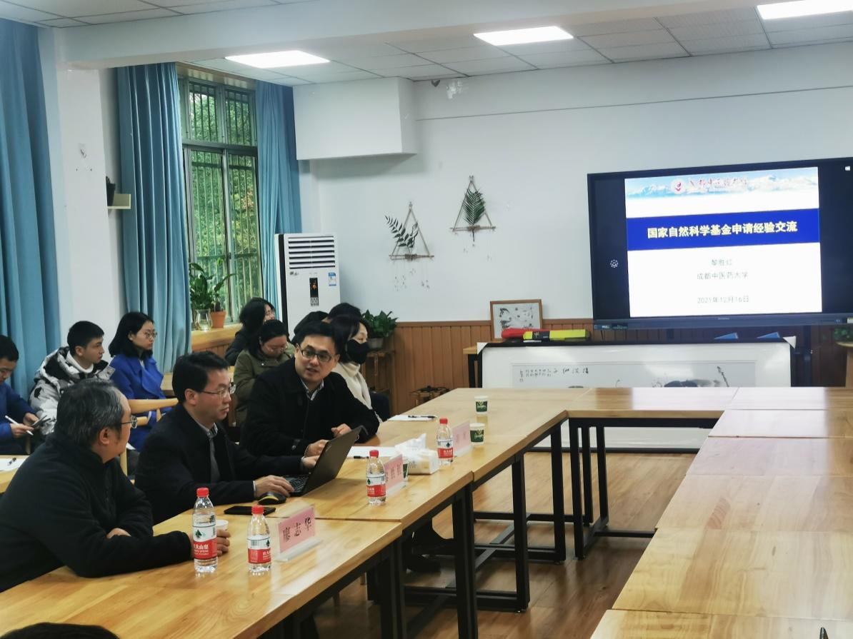 2021年12月16日,成都中医药大学副校长黎胜红首席教授在学院223会议室受邀为学院教师做了国家自然科学基金项目申报培训。即将申请基金项目的生命科学学院、药学院教师60余人参加会议。会议由学院党委书记蒋寒主持。