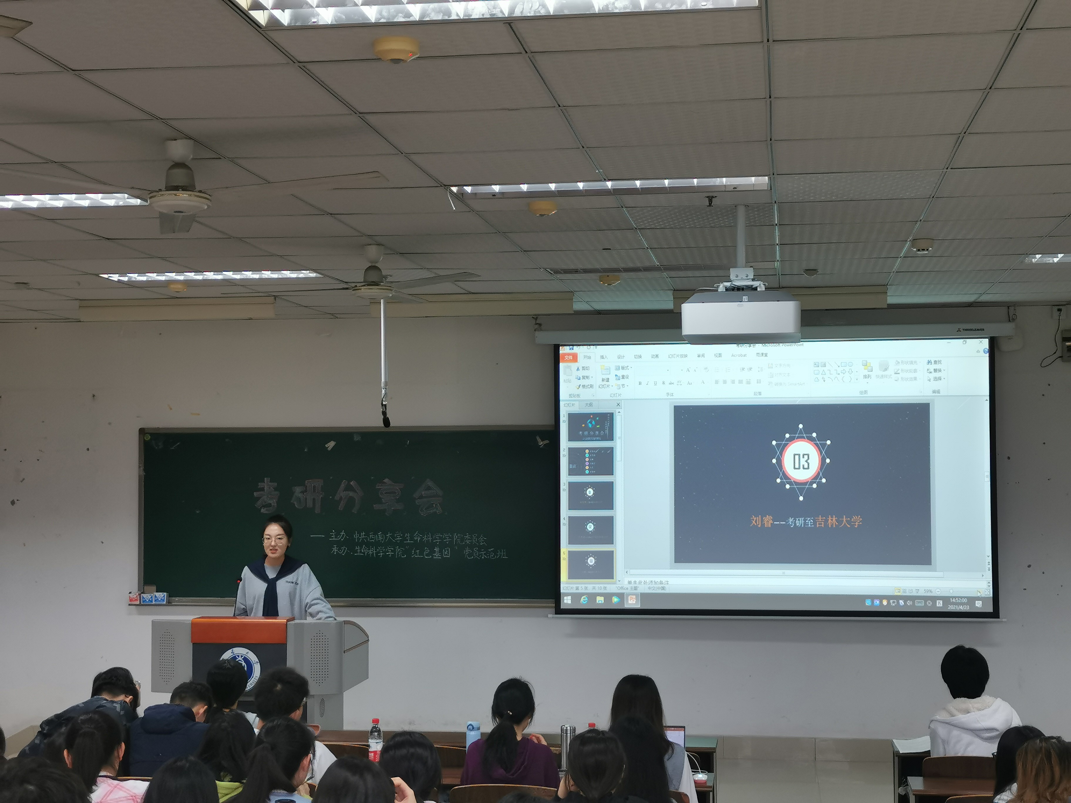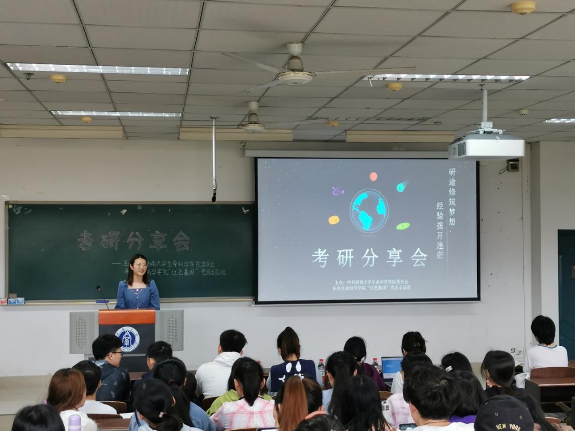 生命科学学院历来重视考研工作。4月23日下午,学院“红色基因”党员示范班举办了“研途修筑梦想,经验拨开迷雾”为主题的考研经验分享会,会议由副班长涂丽梅主持,大一到大三有意愿考研的同学参加了此次分享会。