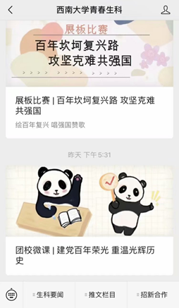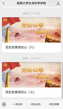 学校党史学习教育动员大会召开后,学院第一时间在微信公众号、网站专门开辟专栏,依托开云kaiyun网页版官网官方微信、青春生科两个新媒体平台,分别推出了《党史故事悟初心》系列党史学习教育栏目和《团校微课:建党百年荣光,重温光辉历史》,截止目前累计推送七期,以青年人喜闻乐见的形式,发动各党支部接力,讲述党史故事,分享“青年党员说”,带领全院师生读好、学好、讲好党史故事,从历史风华感悟初心使命,牢记责任担当。
