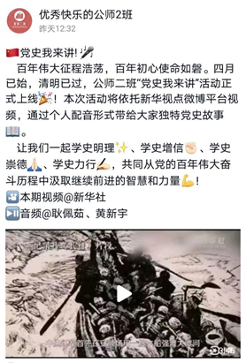 各本科生团支部也以“党史天天讲”为主题纷纷开展了内容丰富、形式多样的主题宣讲活动,掀起“学史明理,学史增信,学史崇德,学史力行”之风。各支部利用“两早一炼”、“每周一学”、课前课后的班级时间,发动全体学生参与其中,讲述党史故事,分享学习感悟,并依托各团支部的线上官方平台设立了如《早安,我的党》栏目、“我在中图党史”、“党史我来讲”线上接力活动等,每日发布“书党史,强心念”推送,以个人配音等形式发布主题教育视频。