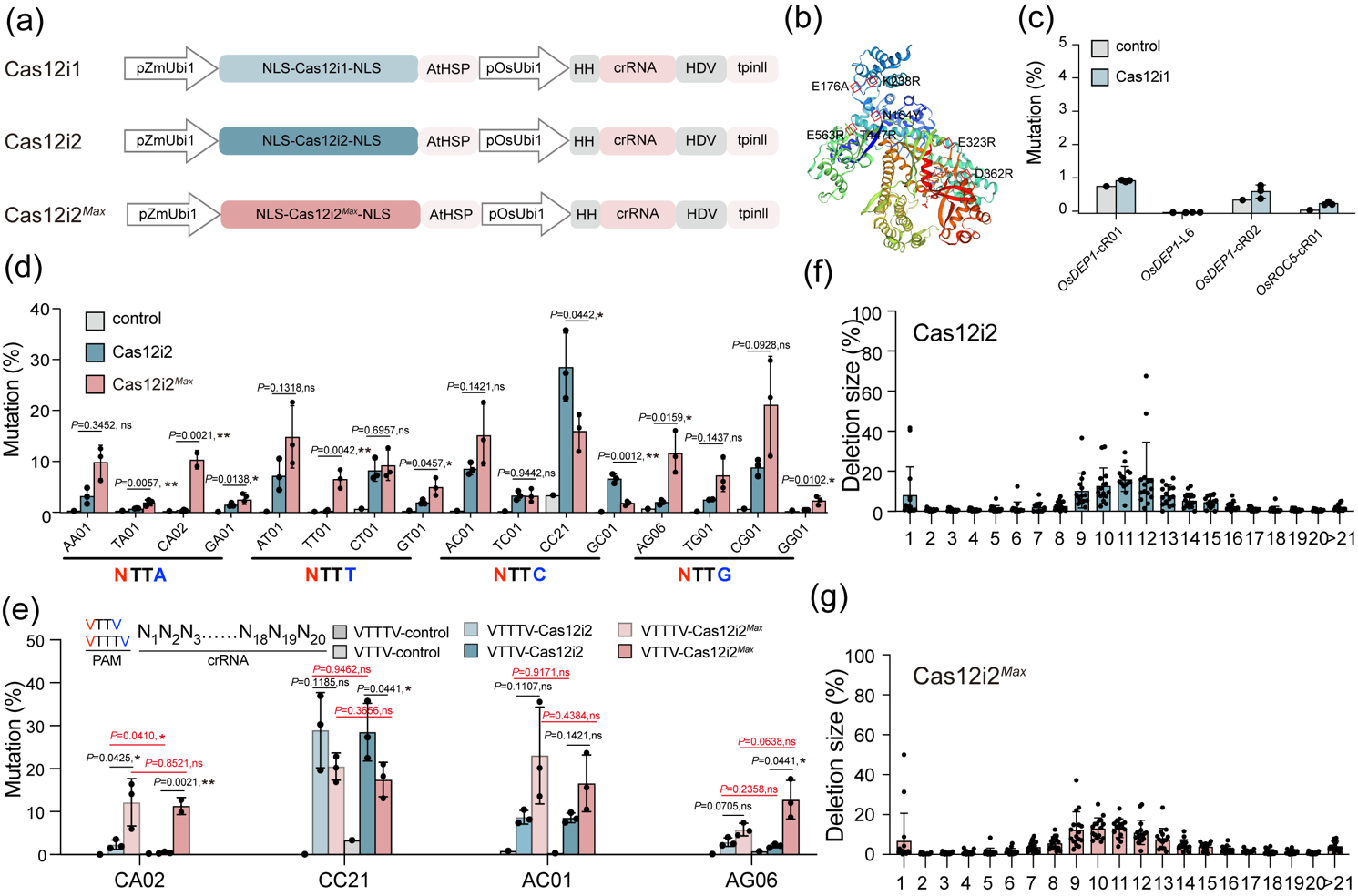 该研究基于此前开发的RZ核酸酶及双Pol II型驱动CRISPR-Cas系统,进行Cas12i1(1093aa)和Cas12i2(1054aa)核酸酶及其变体的植物基因组编辑新系统开发,分析了不同编辑系统的编辑效率、PAM位点偏好性、编辑特异性,实现了水稻内源基因有效敲除编辑、基因定向转录激活及转录抑制,进一步丰富了植物基因组编辑工具库。全文主要结果简述如下: