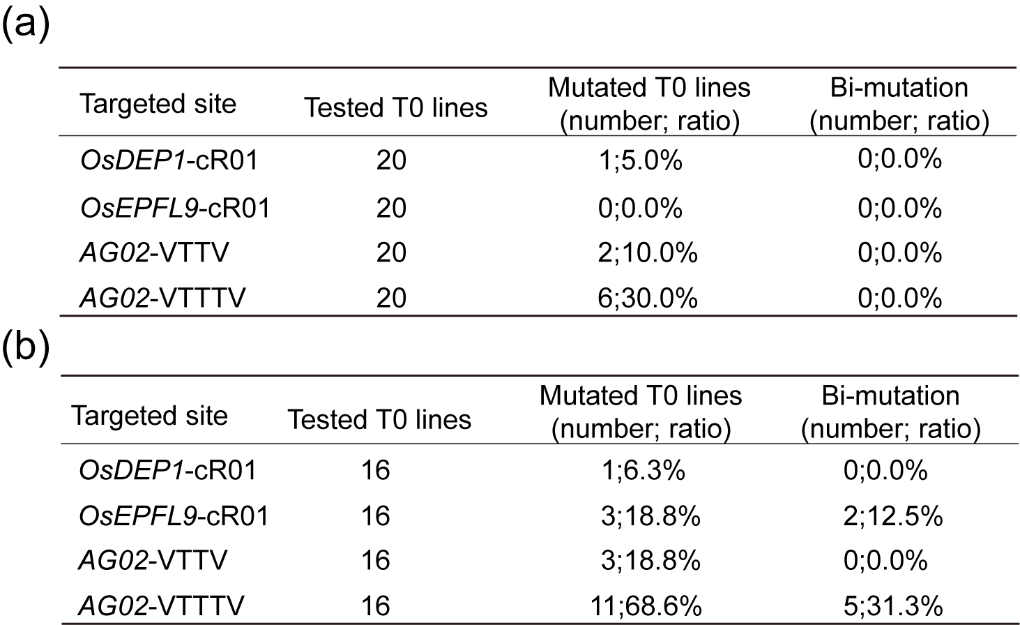 进一步测试Cas12i2和Cas12i2Max在水稻稳定转化植株中的编辑能力,作者在T0代植株中应用Cas12i2和Cas12i2Max实现了有效的基因编辑。对于CRISPR-Cas12i2,在三个位点获得了具有突变的T0植株,突变效率在5%至30%之间(图2a)。Cas12i2Max在所有四个位点都产生了突变T0植株,突变效率在6.3%至68.6%之间(图2b),在测试的位点中,有两个位点显示出双等位基因突变,编辑效率在12.5%至31.3%之间(图2b)。对突变植株的分析表明,突变主要是由多碱基缺失引起的,这与水稻原生质体中观察到的编辑谱一致(图1f和1g)。这些结果有力地支持了Cas12i2Max在稳定的T0水稻植株中进行有效多重基因组编辑的能力。