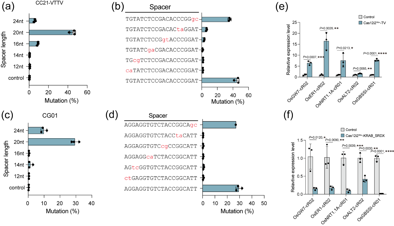 为系统评估Cas12i2Max的靶向特异性,作者选取水稻两个内源位点开展双重验证:首先测试不同长度原间隔区(16bp及更短序列)的影响,其次分析原间隔区1-8bp关键区域错配突变的效果。实验数据显示,上述两种情况下Cas12i2Max均完全丧失编辑活性(图4a-4d),证实其具有严格的序列识别特异性。基于这一特性,研究者进一步开发了Cas12i2Max衍生系统:通过采用16bp截短型原间隔区,在CRISPRa(基因激活)和CRISPRi(基因抑制)实验中成功实现多重基因的精准转录调控,且全程未对水稻启动子靶位点产生编辑(图4e和4f)。