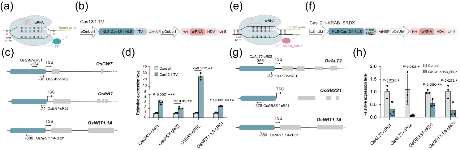尽管Cas12i1的基因组编辑效率较低,但其富含T的PAM需求表明其具有开发转录激活(CRISPRa)和抑制(CRISPRi)工具的潜力。作者在水稻原生质体中使用活性Cas12i1核酸酶和截短的crRNA进行转录调控实验。将Cas12i1与转录激活结构域(6xTAL VP128)或阻遏物结构域KRAB和SRDX融合,分别产生Cas12i1-TV(图3a和3b)和Cas12i1-KRAB_SRDX系统(图3e和3f),水稻原生质体转化结果显示,Cas12i1-TV系统在所有测试位点均实现了基因定向转录激活,其中OsER1-cR02位点显示出25.1倍的增加(图3c和3d);Cas12i1-KRAB_SRDX系统在所有测试位点均实现了基因定向转录抑制,基因表达水平被抑制到约50%或更低(图3g和3h)。